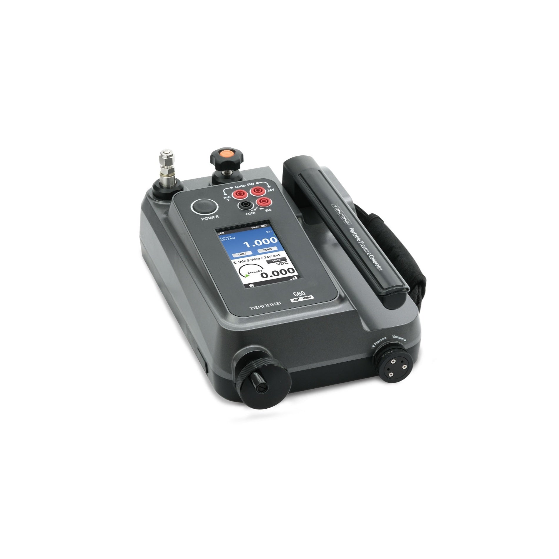 The Tekneka 660 is a portable pressure calibrator for pneumatic pressure calibration up to 100 bar that generates pressure and has precision control. It is a independent pressure calibration instrument that combines electrical signal measurement and loop power to quickly and conveniently calibrate for extensive on-site calibration. Using a Dual-stage lever-type hand pump that can generate and control up to 100bar of pneumatic pressure with an accuracy of 0.02% F.S, then use the built-in volume controller to accurately regulate the pressure with the secondary fine pressure control. The Tekneka 660 also has a Pressure/Vacuum switching valve that generates up to -970mbar in vacuum mode, which is the best vacuum degree in its class. The full-graphic touchscreen display, along with an intuitive menu selection, provides excellent visibility and operability. The upper side of the Tekneka 660 is equipped with connectors and adaptors for quick and easy UUT connections.